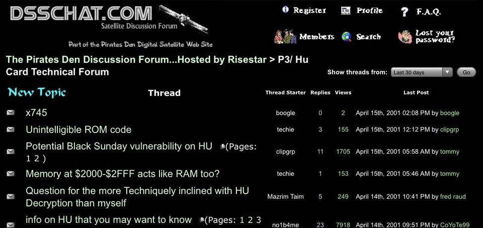 Popular forums of the time included The Pirates Den (dsschat .com), Interesting Devices (id-discussions), Innermatrix, DR7 .com, Hitec Sat, and dozens others. Many forums were owned by pirate dealers, and some acted as administrators or moderators on others.