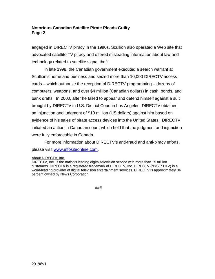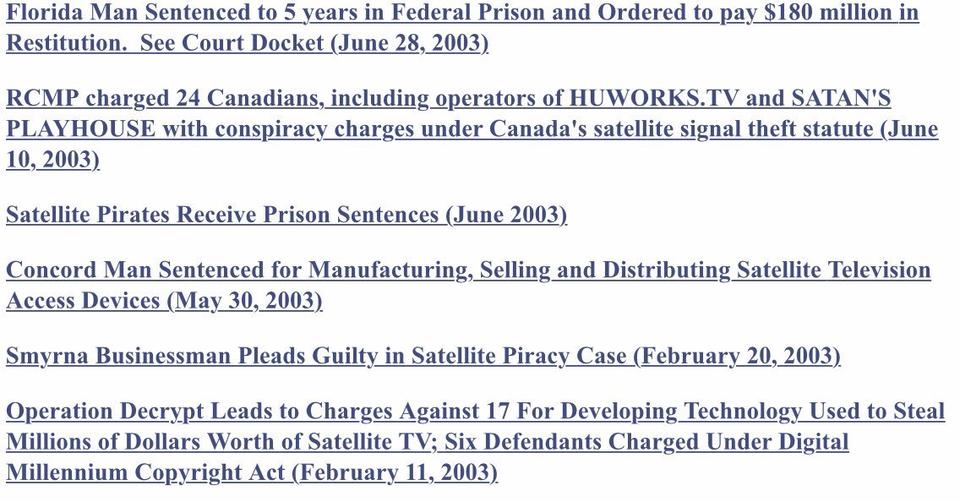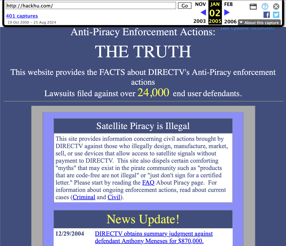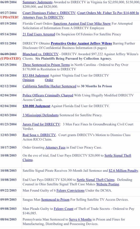 Some of these hackers’ names would later show up on a DirecTV website publicizing the many legal actions taken against pirates. DirecTV would proudly boast over 24,000 lawsuits against end users, in addition to action against the hackers and dealers.