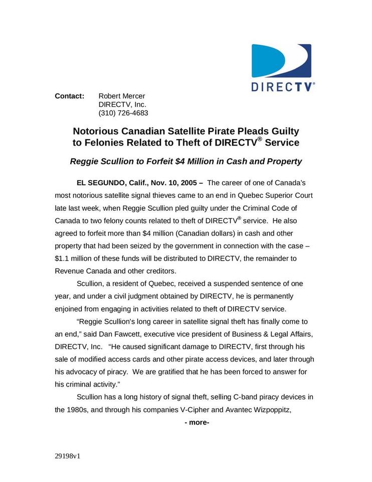Satellite TV piracy was big business. In 1998, Canadian pirate Reggie Scullion (V-Cipher) was raided by police and $4 million in cash, bonds, and bank drafts was seized from his home and business, along with over 10,000 DirecTV smartcards. Pirate business was booming.